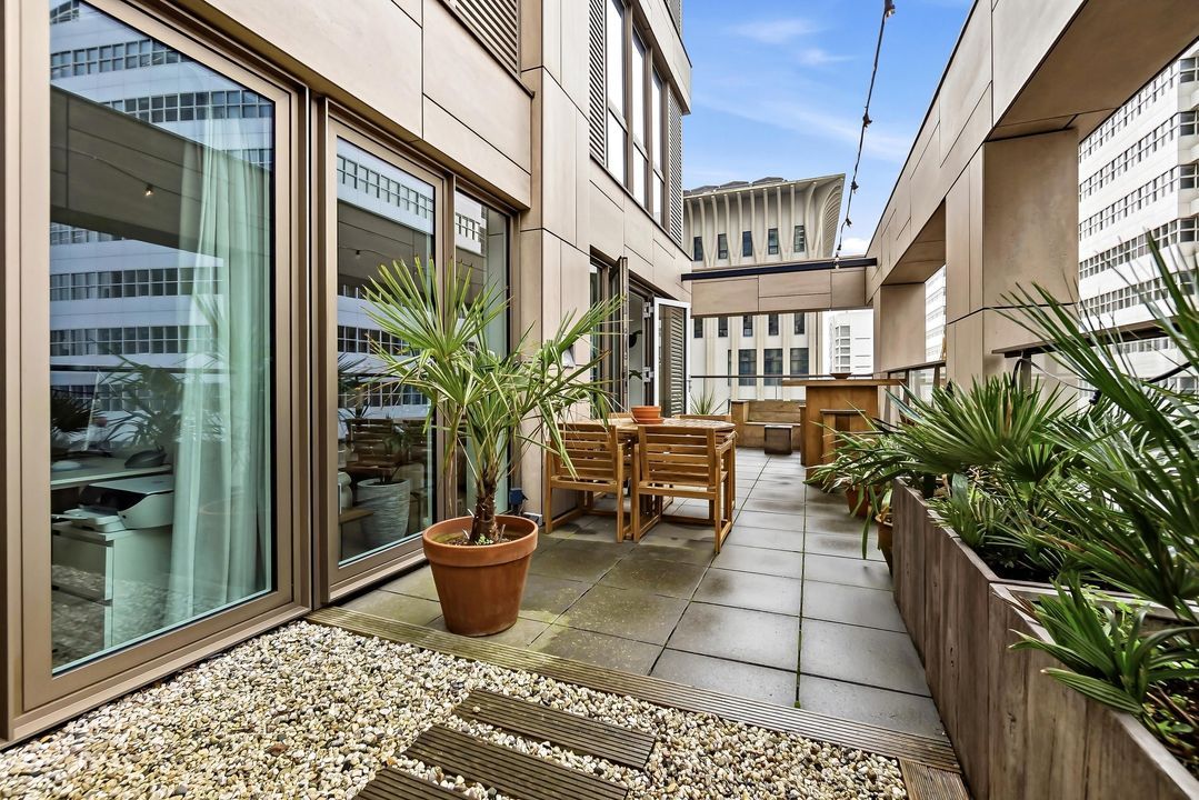 Zodra je de woonkamer binnenstapt, valt direct de indrukwekkende leefruimte op en de kwaliteit van de afwerking. De royale woonkamer is heerlijk licht dankzij de grote raampartijen en biedt volop plek voor een comfortabele zithoek en een grote eettafel. De zon stroomt hier rijkelijk naar binnen en zorgt de hele dag voor een warme, open sfeer. Vanuit de woonkamer stap je zo het absolute hoogtepunt van het appartement op: het grote en zonnige terras. Deze prachtig ingerichte buitenruimte voelt als een groene oase midden in de stad. Het is de perfecte plek om te ontspannen in de zon, uitgebreid te dineren of gezellige borrels te geven met vrienden terwijl de stad om je heen leeft.